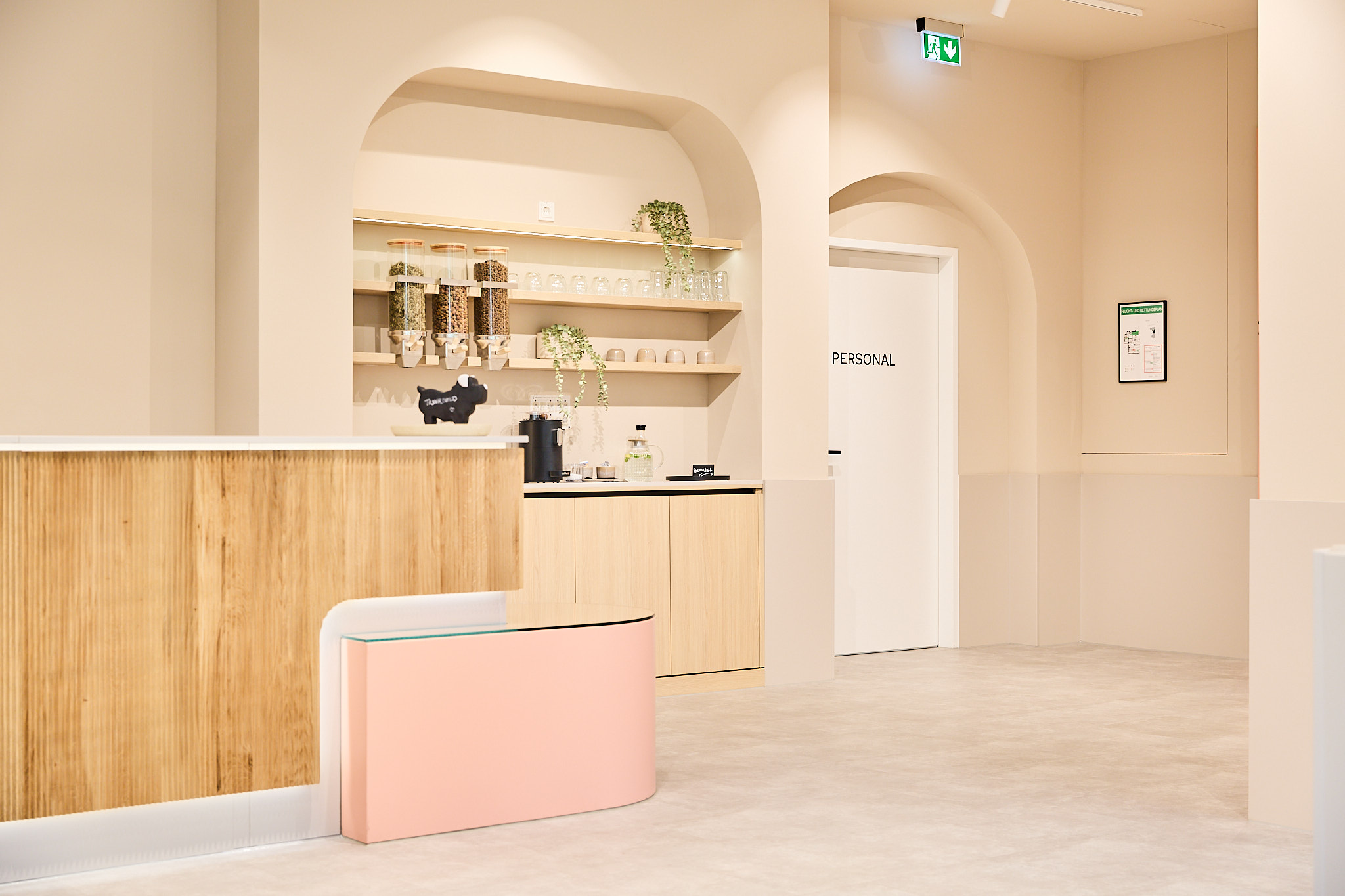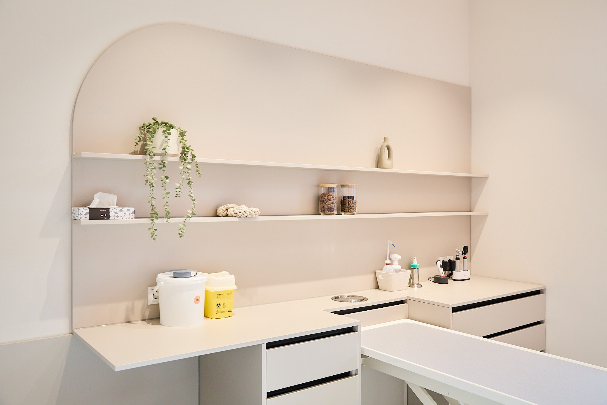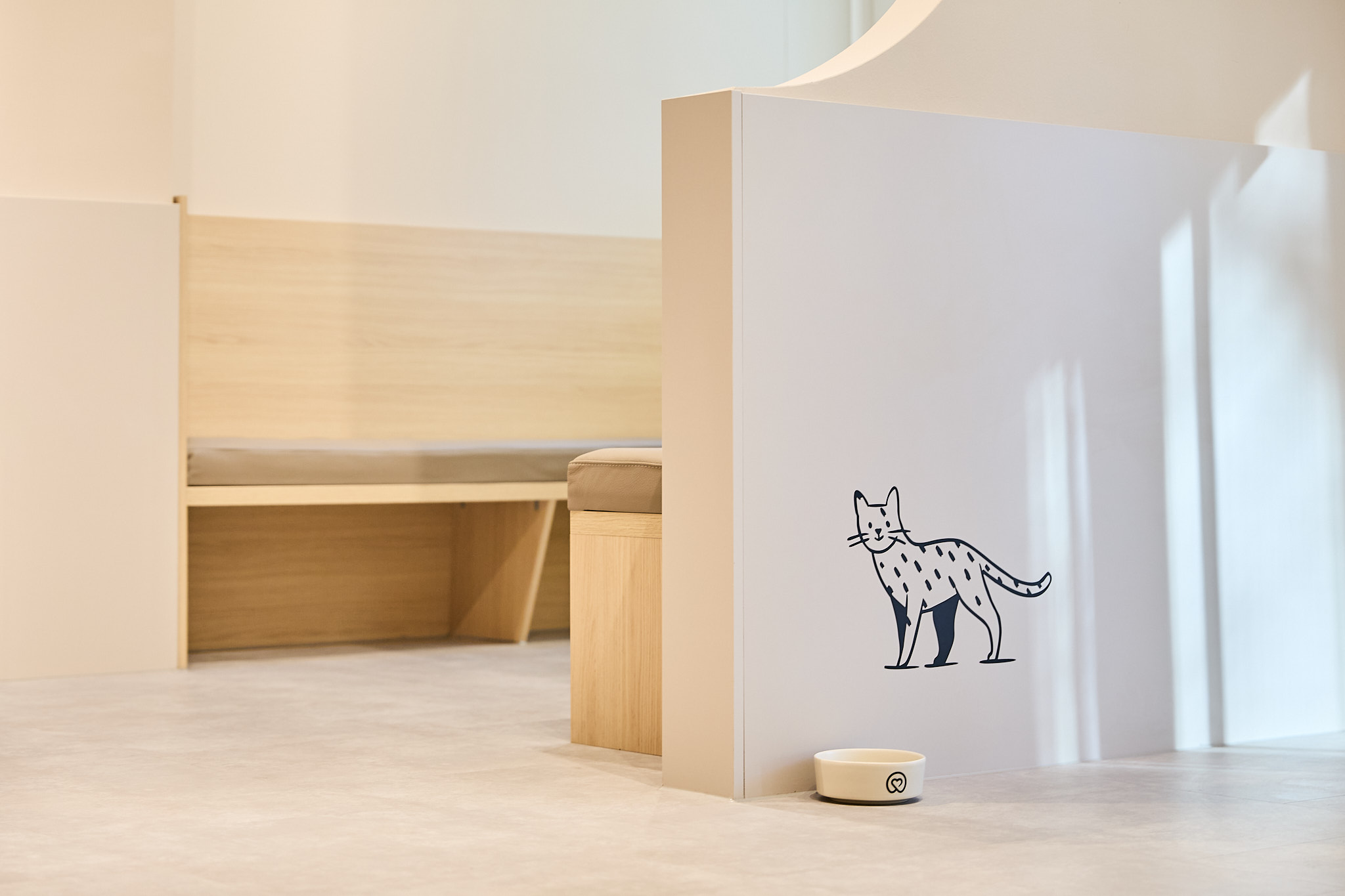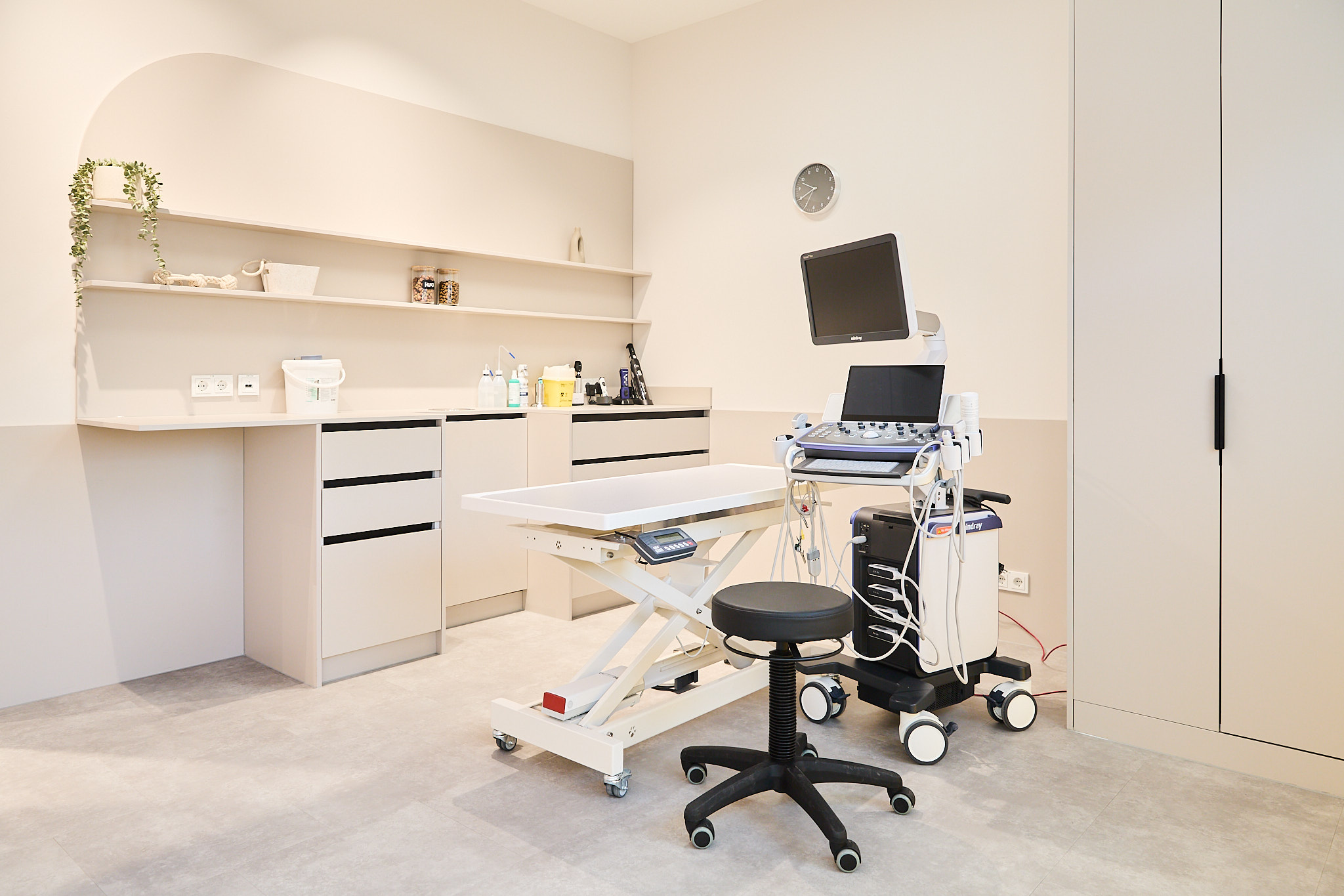 Zur Ausstattung gehören höhenverstellbare Behandlungstische, ein separates Behandlungsareal für z.B. Blutentnahmen und OP-Vorbereitungen, Weichteil- und Dental-OP-Räume mit Dentalröntgen, digitales Röntgen, ein kardiofähiges Ultraschallgerät sowie ein Inhouse-Labor für Blut-, Urin-, Kot- und Zytologieanalysen. Eine Apotheke sowie eine stationäre Tagesaufnahme ergänzen das medizinische Angebot. Für das Team stehen separate Toiletten, Umkleiden mit Spinden sowie eine voll ausgestattete Küche mit Müslibar, Kaffee, Wasser und Obst zur Verfügung. Ein Doc Office und Büroräume fürs Praxismanagement bieten Rückzugsorte für ungestörtes Arbeiten.